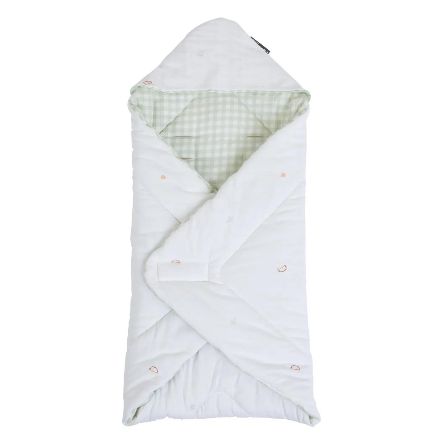 Cette couverture universelle douce avec capuche gardera votre bébé bien au chaud. La couverture en jersey est ornée d’un motif de petites figures mignonnes (un cœur, une feuille et un hérisson) d’un coté et de l’autre d’un vichy vert.Utilisez la couverture pour envelopper confortablement votre bébé dans un transat ou une poussette. Grâce aux ouvertures pour les sangles de sécurité, vous pouvez utiliser la couverture en toute sécurité dans un transat ou un siège-voiture.
