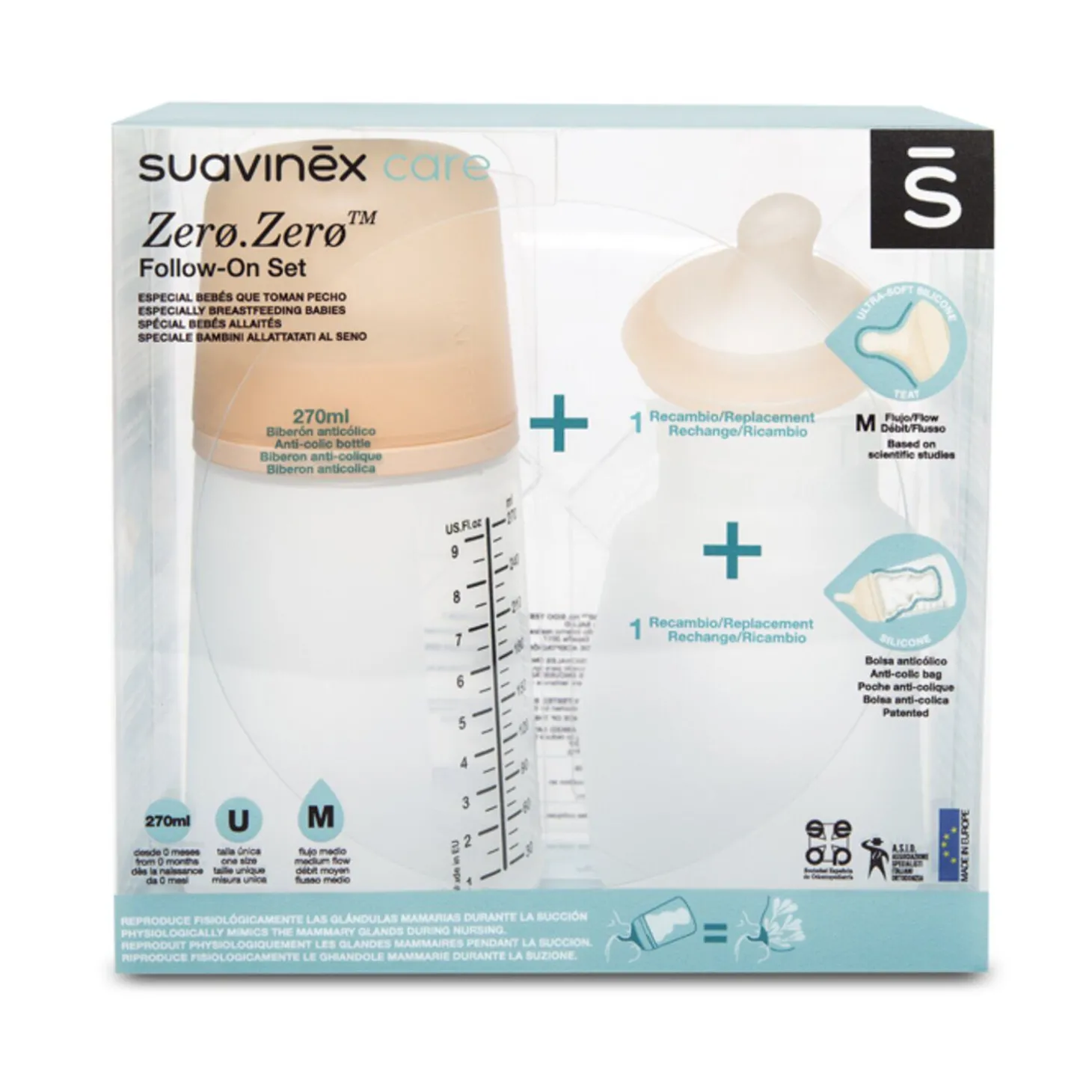 Ce pack comprend 1 biberon ZERO.ZERO 270 ml, une poche en silicone supplémentaire ainsi qu’une tétine au débit moyen (M) de rechange.